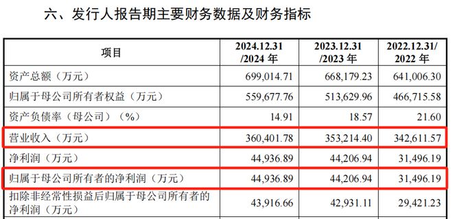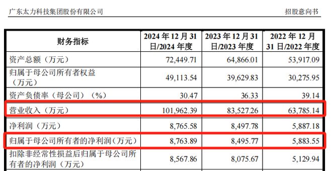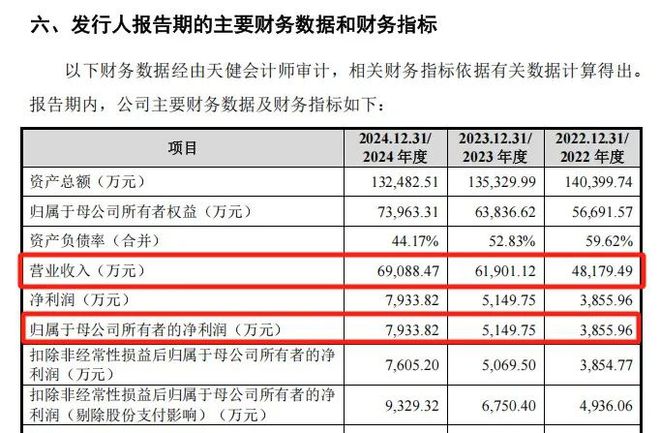 2022年至2024年,汉邦科技的营业收入分别为4.82亿元、6.19亿元、6.91亿元,归母净利润分别为3855.96万元、5149.75万元、7933.82万元。