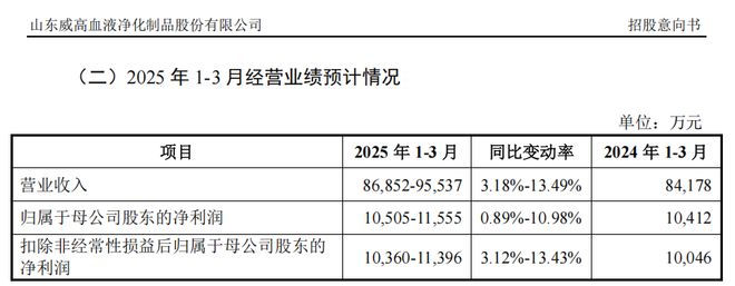 威高血净管理层预计,公司2025年第一季度的营业收入为8.69亿元至9.55亿元,同比变动率为3.18%至13.49%;归母净利润为1.05亿元至1.16亿元,同比变动率为0.89%至10.98%。