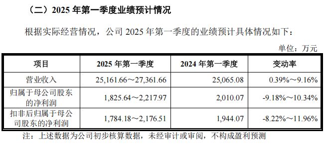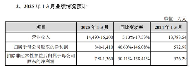 汉邦科技管理层预计,公司2025年第一季度的营业收入为1.45亿元至1.62亿元,同比变动率为5.13%至17.53%;归母净利润为840万元至1410万元,同比变动率为46.60%至146.08%。