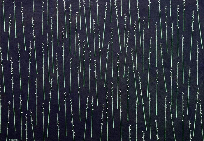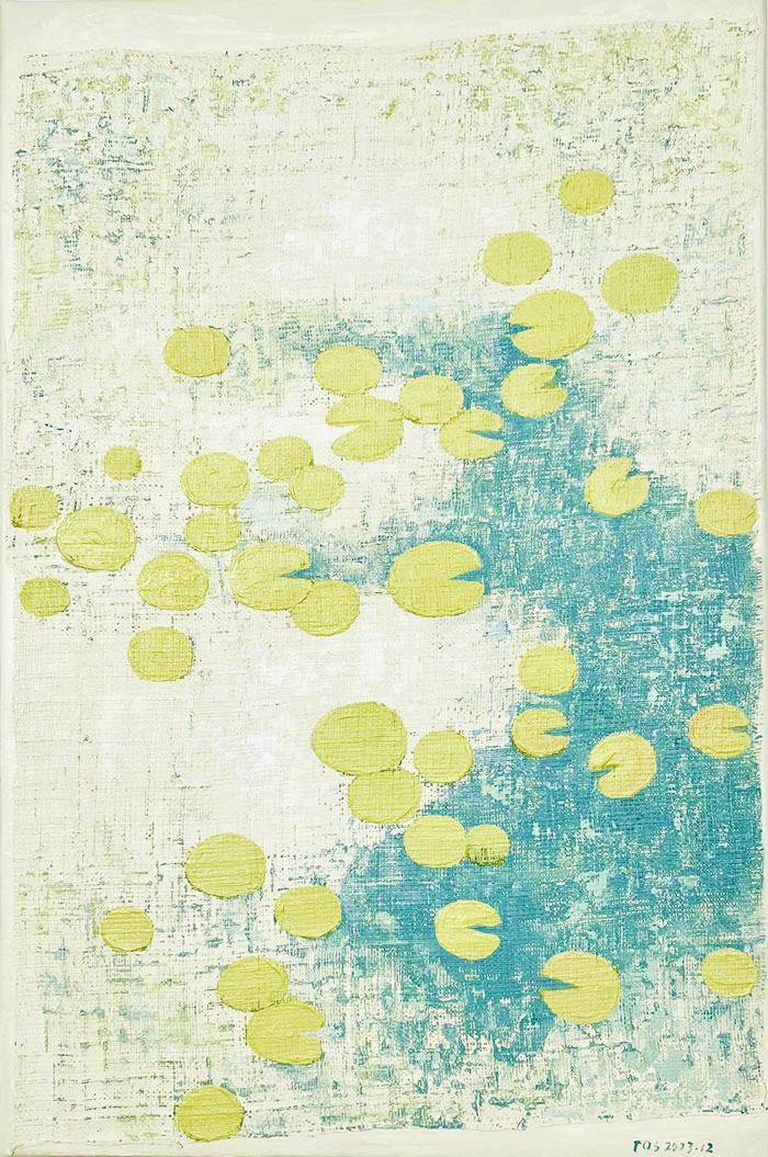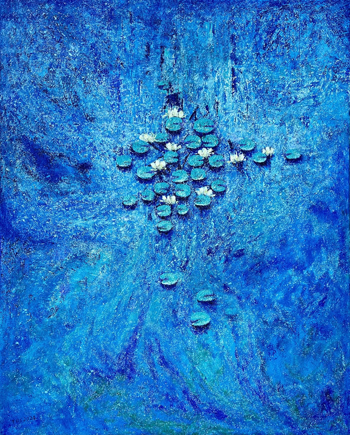 睡莲这一题材被印象派画家莫奈画过以后,已经鲜有艺术家尝试,他人很难画出新意。唐岐山的《睡莲》系列作品,大胆追求对传统创作范式的突破。创作初始,他秉持极简主义理念,力求以简洁的线条和笔触勾勒形象,摒弃繁杂的元素,使画面呈现清新单纯的视觉效果。继而,他巧妙地引入中国画的留白技法,使作品瞬间增添了灵动、悠远的气韵。莲叶、水草与浮萍的布局疏密有致,错落得当,留白之处恰似开启了一扇通往无限遐想的窗扉,整幅画作由此弥漫着空灵静谧的诗意氛围。画面的核心元素——莲叶,被简化为具有独特表意功能的符号,具有强烈的视觉辨识度。画家还融入了西方构成理念,打破了传统二维画面的扁平局限,通过巧妙的布局与设计,赋予画面以丰富的立体感与层次感,拓展了画面的空间维度与视觉张力。为了避免极简风格陷入单调与平庸的泥沼,他特意选用麻布与石英砂作为画面的创作材质,通过摩挲与处理,营造出细腻而独特的肌理质感。这一系列作品尽管融合了西方艺术元素,但作品深处依然流淌着中国传统文化的精神血脉,中西两种艺术元素非但未产生冲突,反而相互交融、彼此辉映,实现了和谐共生的艺术境界。中国传统艺术的空灵意境与西方艺术的结构张力相得益彰,兼顾了简约与丰盈的双重审美特质。