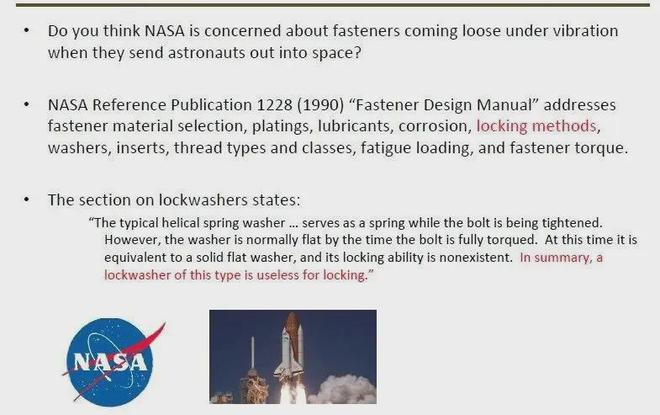同时,美国宇航局(NASA)也发现了开口弹簧垫圈的问题,在NASA标准中在锁紧螺母一章中,这样写道:“典型的螺旋弹簧垫圈…在螺栓紧固的时候起到弹簧的作用。可是,当螺栓被完全紧固的时候,垫圈一般来讲是变平了。在这个时候,完全可以将它当作一体平垫圈,它的锁紧功能根本不存在。总而言之,这种类型的锁紧垫圈对于锁紧而言,一无是处。”原文节选,参见下图: