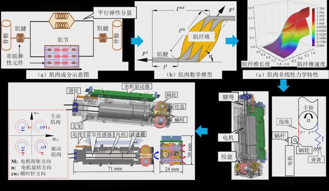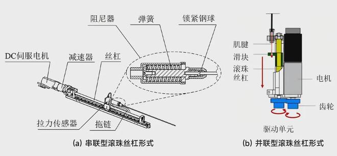 在驱动方式上,刚性传动灵巧手通过齿轮、蜗轮蜗杆、滚珠丝杠、连杆等机构直接传递电机扭矩,具有能效高、响应快、结构紧凑等优势。微型模块化设计虽进一步优化了其空间利用率,但也带来了功率密度与散热限制、灵巧性与负载能力矛盾、传感器集成困难以及微小型化带来制造与可靠性问题等关键挑战。与刚性传动相比,绳驱传动原理类似人类用肌腱控制手指,主要借助柔性绳索来传递动力,其核心设计在于将大功率驱动源(相同力输出情况下发热量较小)配置于远端(如手掌内、小臂等部位),通过精心设计的滑轮与导管走线系统,有效降低末端执行器的重量与转动惯量,显著提升动态响应性能。