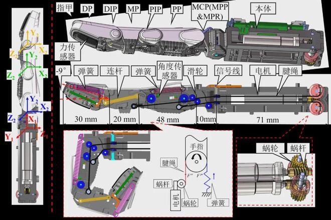 要实现灵巧手的自由度、柔顺性和运动特性,达到类人水平,硬件的驱动效率提升、成本降低和触觉传感精度与密度增强至关重要。灵巧智能对灵巧手进行了模块化前驱动设计:分析人手核心功能,在保留关键功能的同时,优化体积重量。食指、无名指、小指的MCP关节由电机+丝杠滑块驱动;MPP/PIP关节由双排电机组+蜗轮驱动肌腱控制。指尖配备多点阵电容传感器及增加摩纹理橡胶。