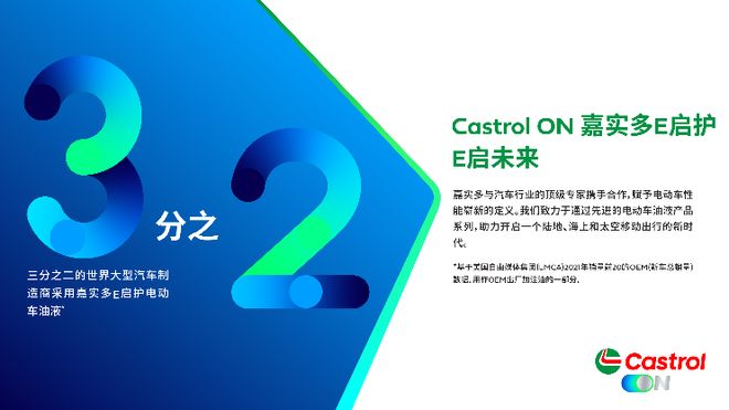 长期以来,嘉实多是奥迪、捷豹路虎、沃尔沃、大众汽车、福特等众多世界领先汽车厂商的合作伙伴和推荐品牌,并与它们共同开展技术研发,度身定制高品质的嘉实多专享润滑油产品,期待以更好的产品和服务来实现对广大中国消费者的承诺。同时,嘉实多致力于开拓增长市场以发展业务,在全球专注于拓展品牌服务和养护方案,提供市场领先的电动车油液产品。全球三分之二的主要汽车制造商都在使用Castrol ON嘉实多E启护系列产品¹。